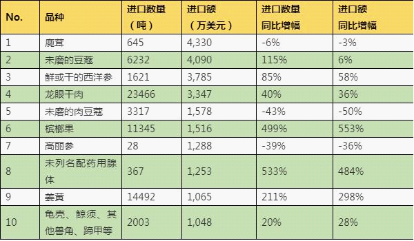 2.进口药材品种TOP10上半年,我国进口药材前十大品种(进口TOP10品种)为鹿茸,豆蔻,西洋参,龙眼,肉豆蔻,槟榔果,高丽参,未列名配药用腺体,姜黄,龟壳、鲸须、蹄甲。进口TOP10品种占我国上半年中药材进口总额的94%。